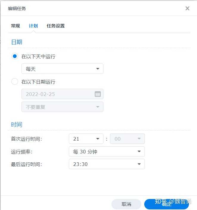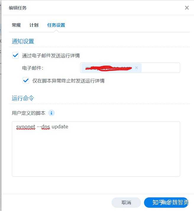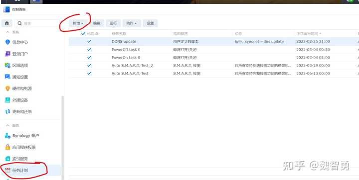 一般情况下,自架的群晖服务器由于缺少固定的IP地址(这里指公有IP地址,如果没有公网IP,则可能需要采用内网穿透等方式才能在外部访问群晖服务器),需要依赖动态域名解析(DDNS)服务来保证域名的动态更新,这样,在外部IP地址发生变化时,可以通过DDNS服务及时将域名解析到新的IP地址上。但是群晖自带的DDNS默认更新频率(大约)是24小时,这导致如果网络服务商更换了IP地址,可能导致长时间无法访问服务器,为解决这一问题,可以考虑使用群晖内置的计划任务定时执行DDNS更新,这样可以缩短服务器外部IP变化时引起服务器无法访问的情况。在DSM7.0的控制面板,计划任务中,选择新增任务,任务名称可以随便填写,这里写DDNS update,用户需要切换为root,见下图: